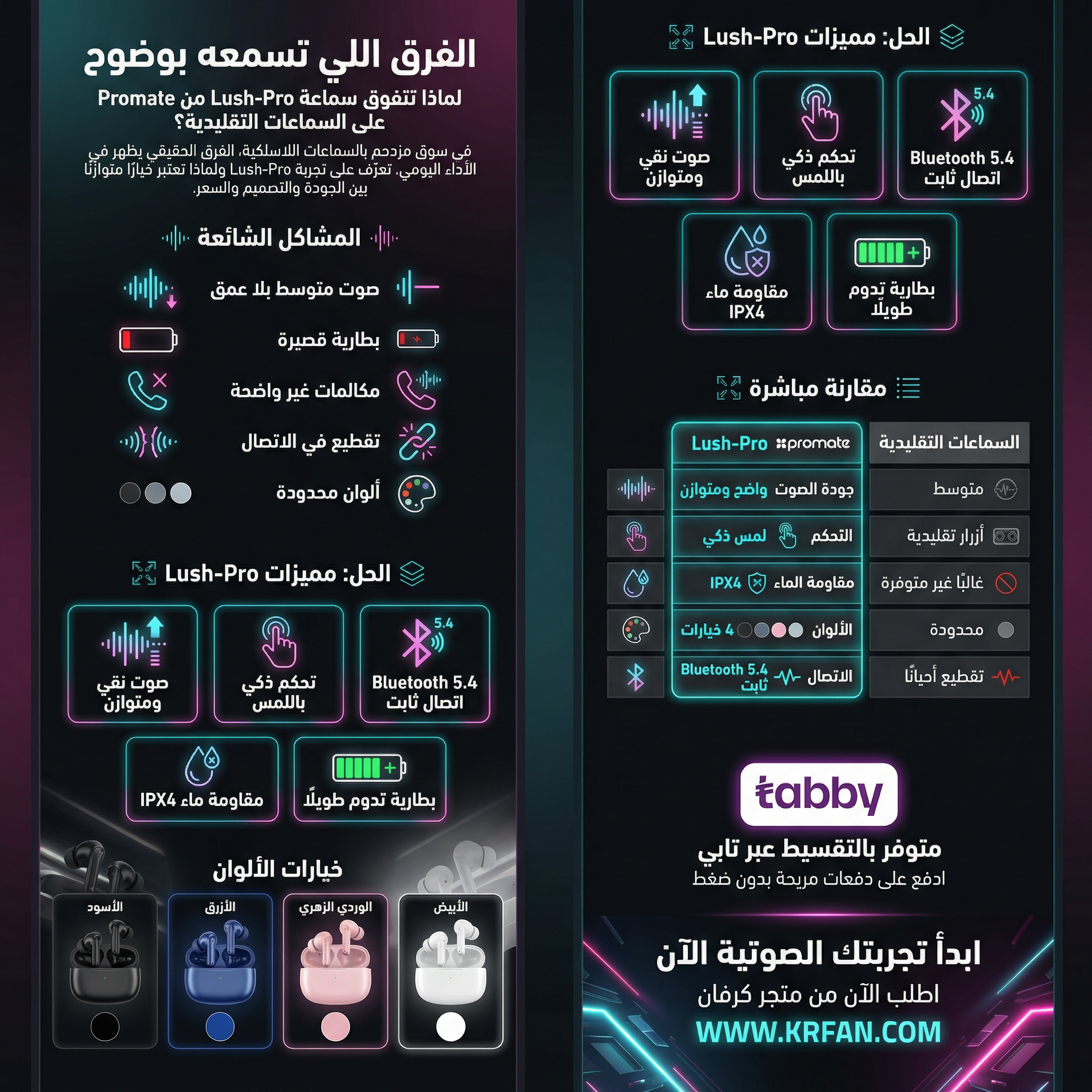 المعيارLush-Proسماعات تقليديةجودة الصوتواضح ومتوازنمتوسطالتحكملمس ذكيأزرار تقليديةمقاومة الماءIPX4غالبًا غير متوفرةالألوان4 خياراتمحدودةالاتصالBluetooth 5.4 ثابتتقطيع أحيانًا
